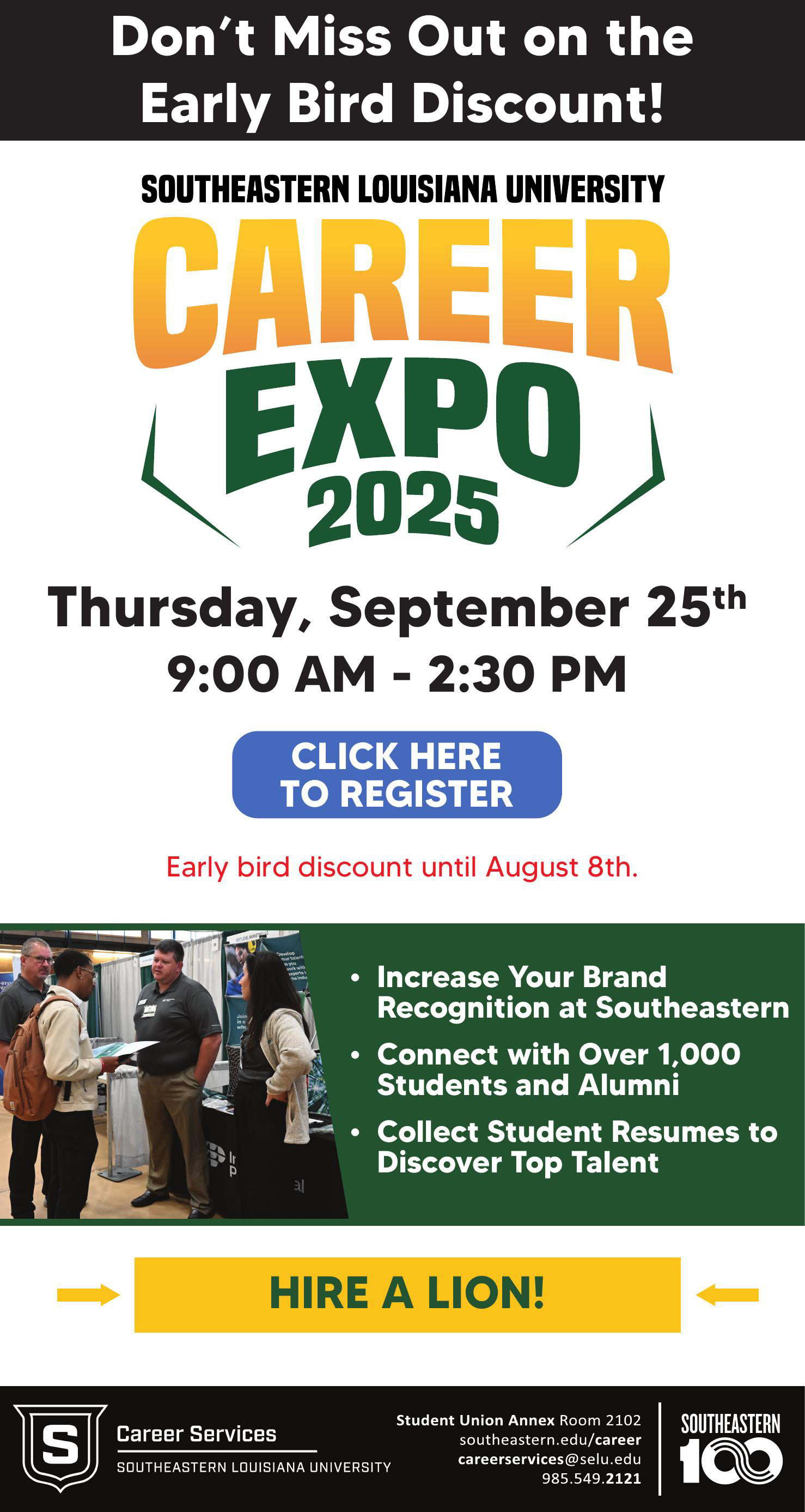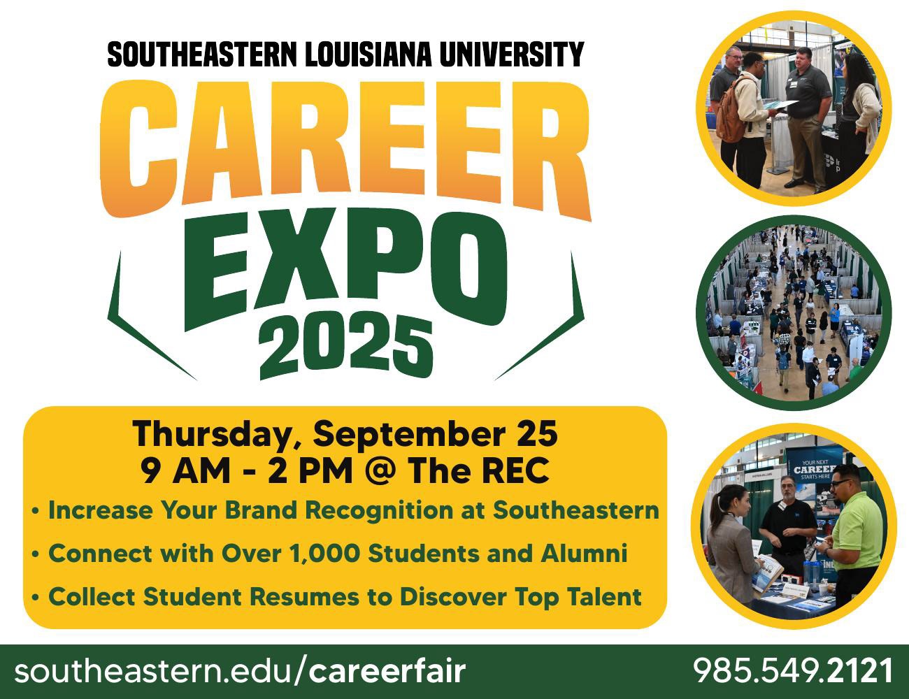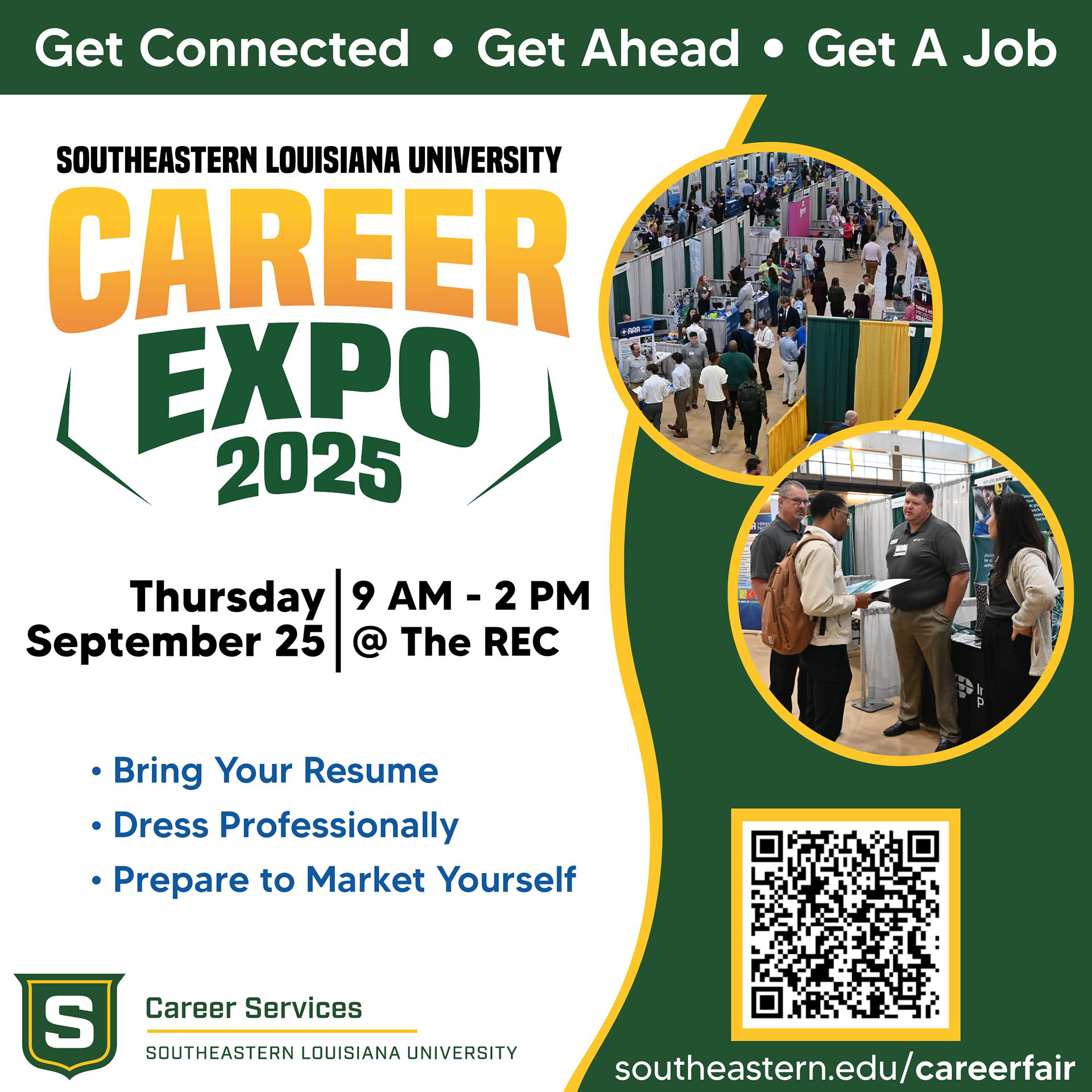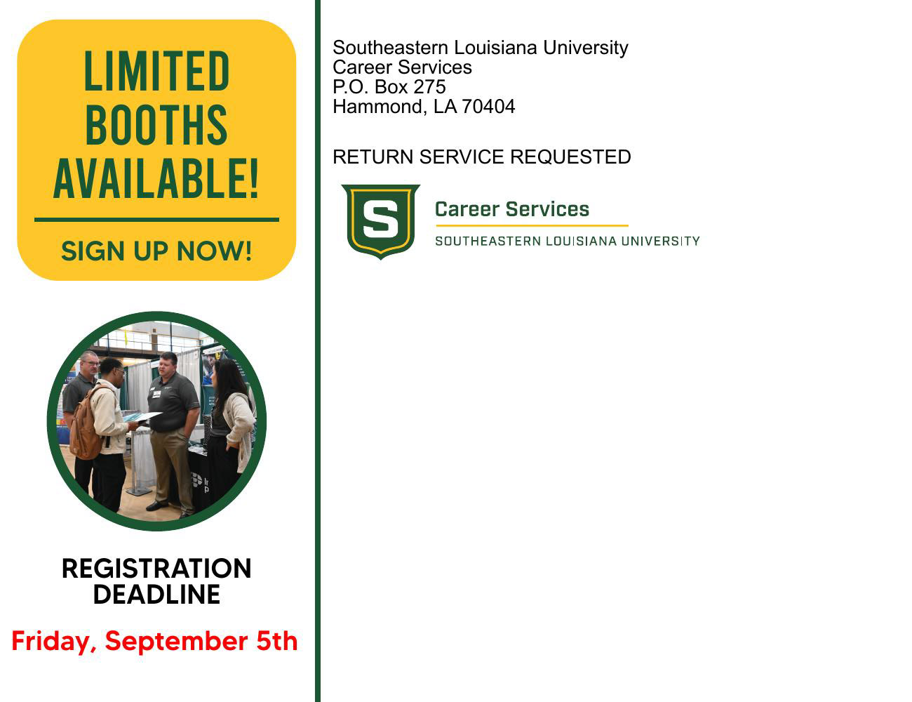 Career Expo is Southeastern Louisiana University Office of Career Services' all-major career fair, which takes place each September. Recruiters can engage with hundreds of Southeastern students to meet their hiring demands, and students can find a company that fits their needs. Career Services also holds Pre-Fair Events which prepare students for the Expo.