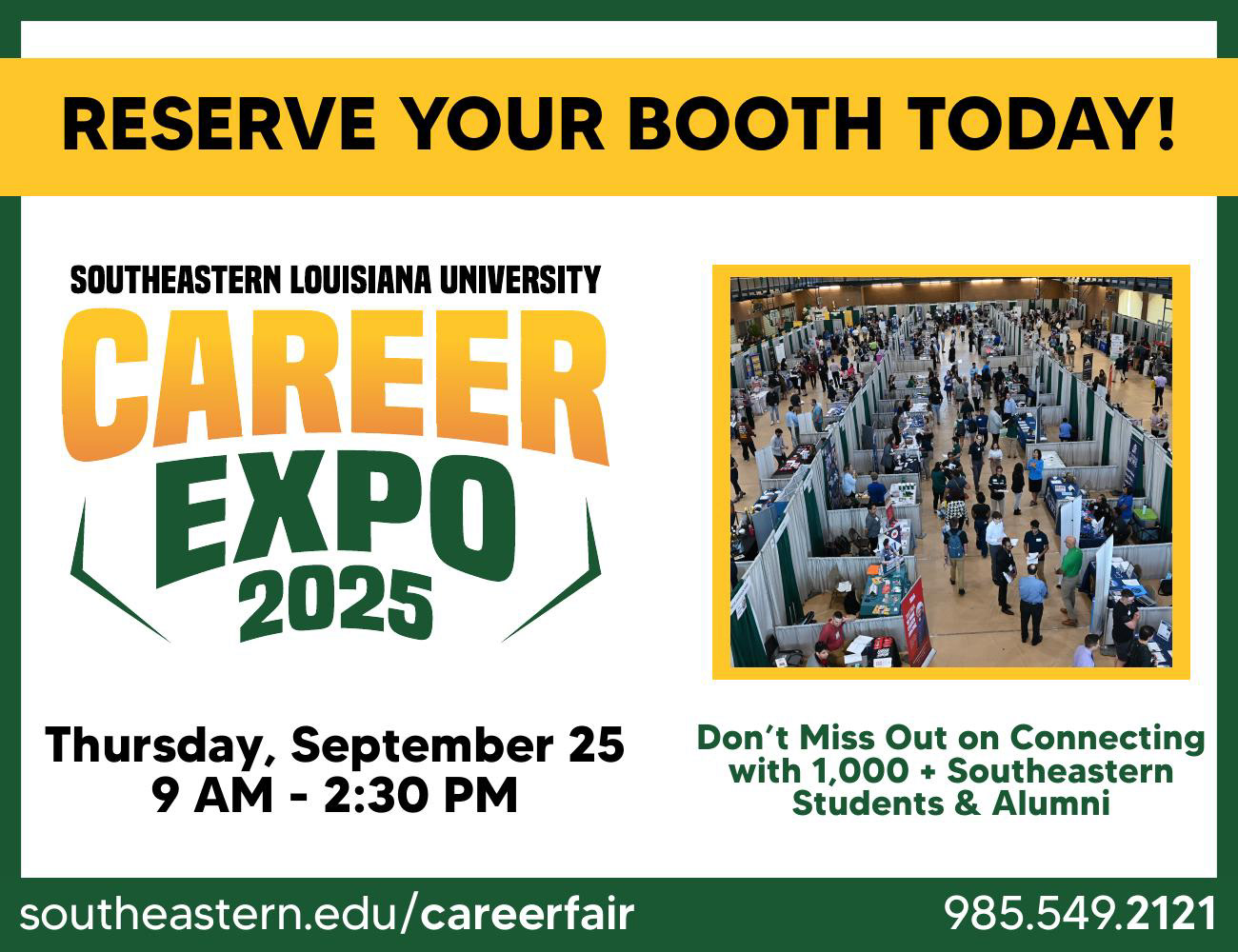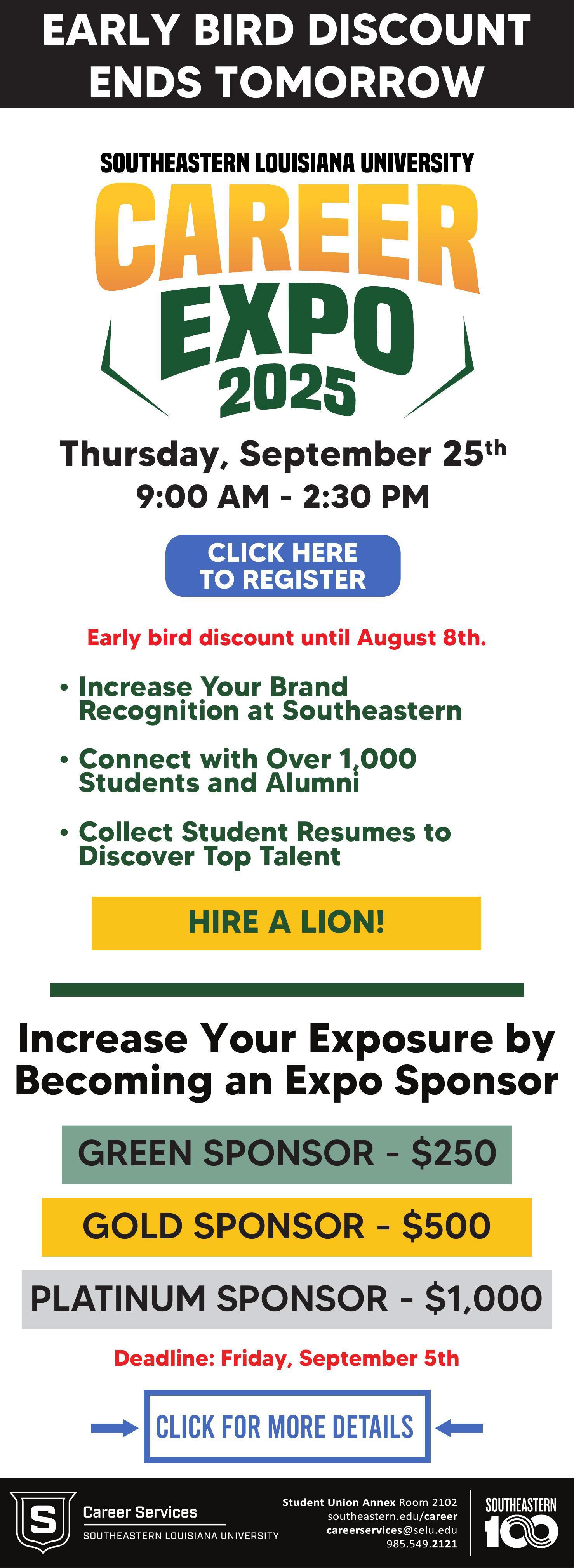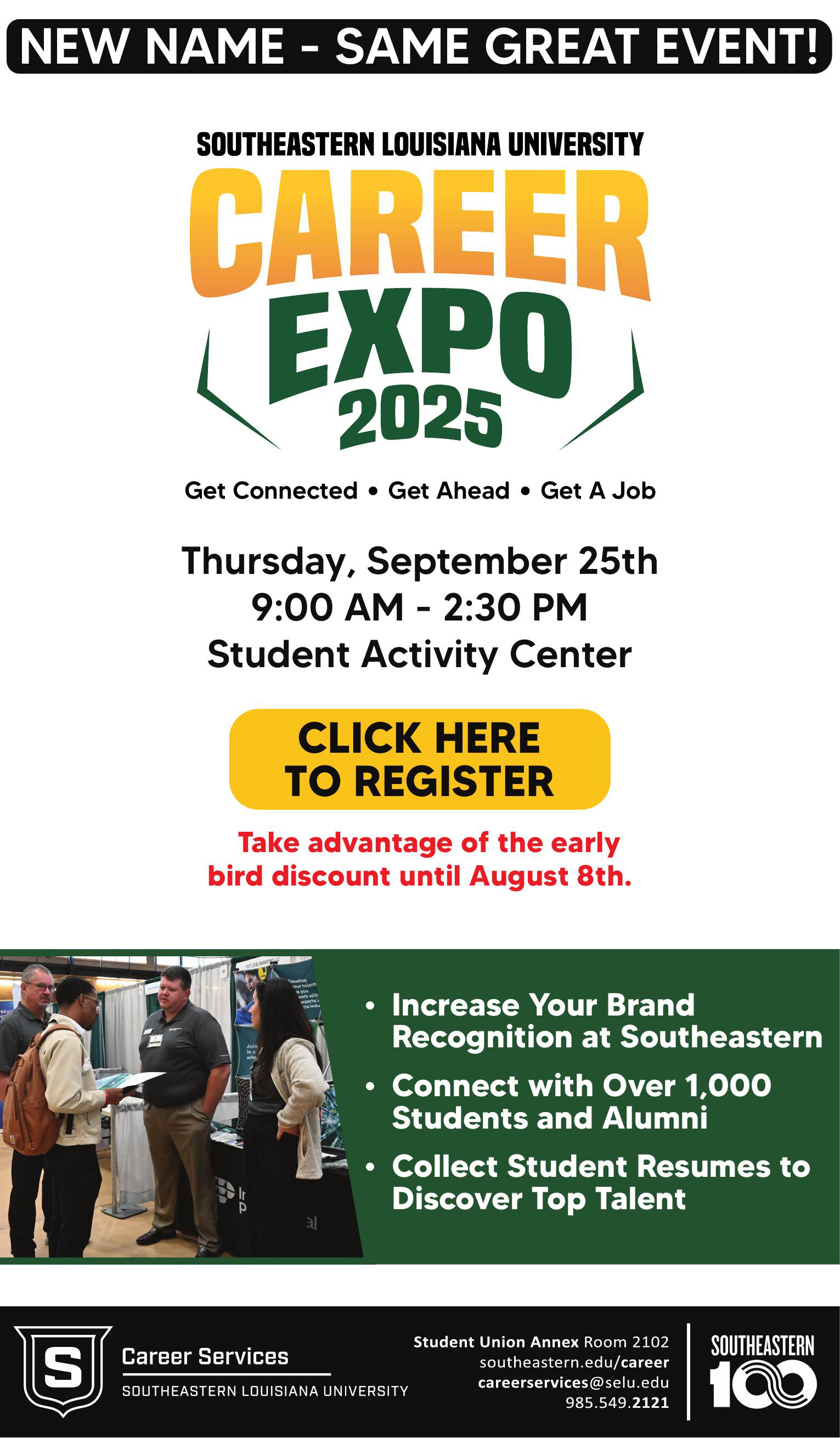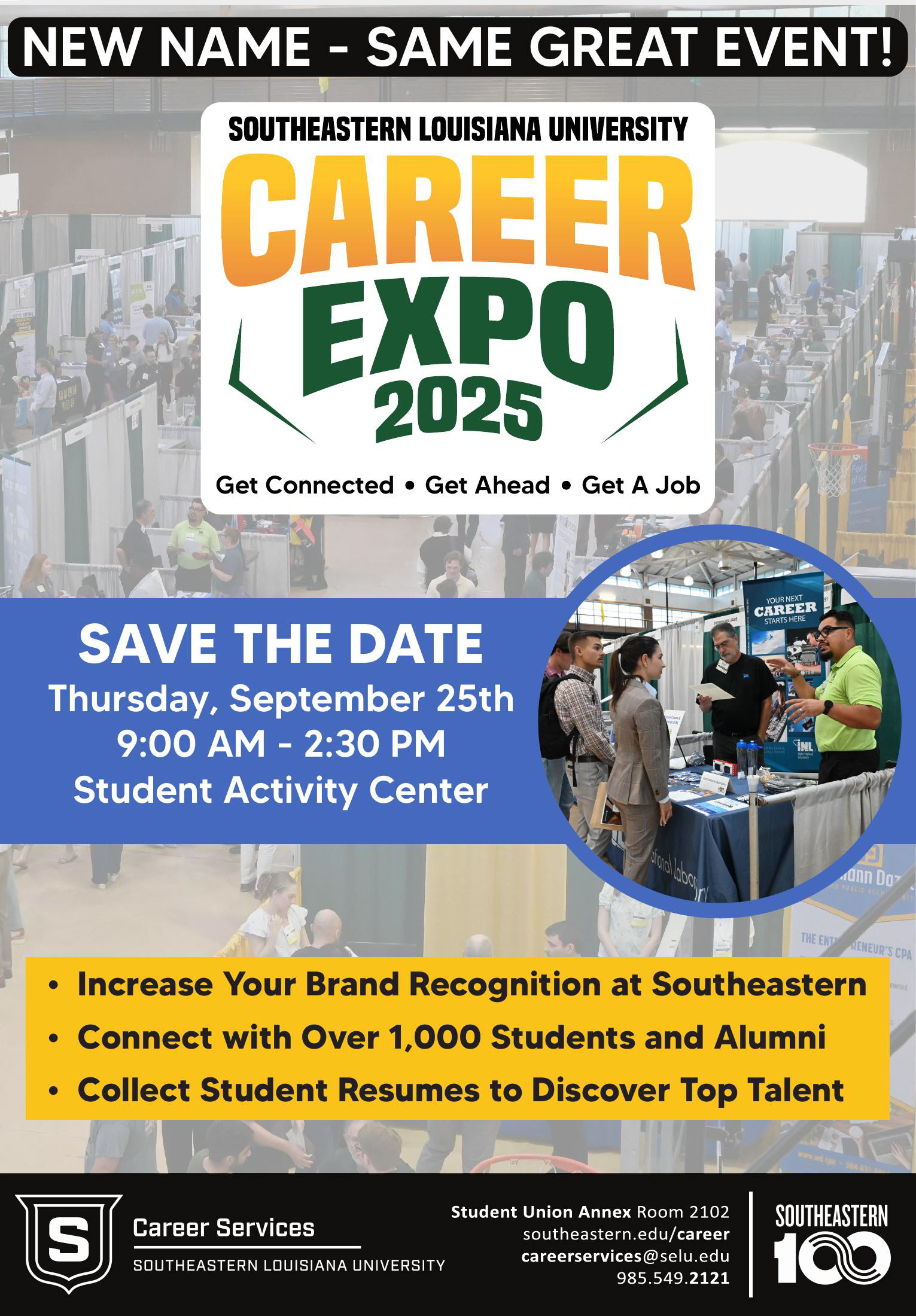 Career Expo is Southeastern Louisiana University Office of Career Services' all-major career fair, which takes place each September. Recruiters can engage with hundreds of Southeastern students to meet their hiring demands, and students can find a company that fits their needs. Career Services also holds Pre-Fair Events which prepare students for the Expo.