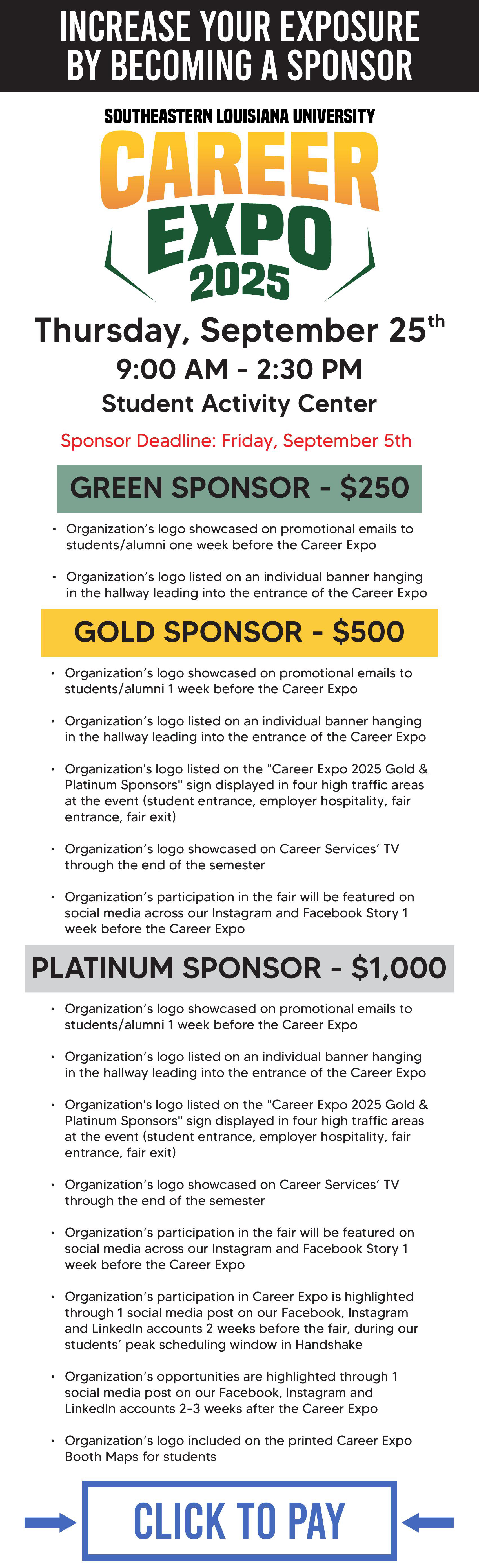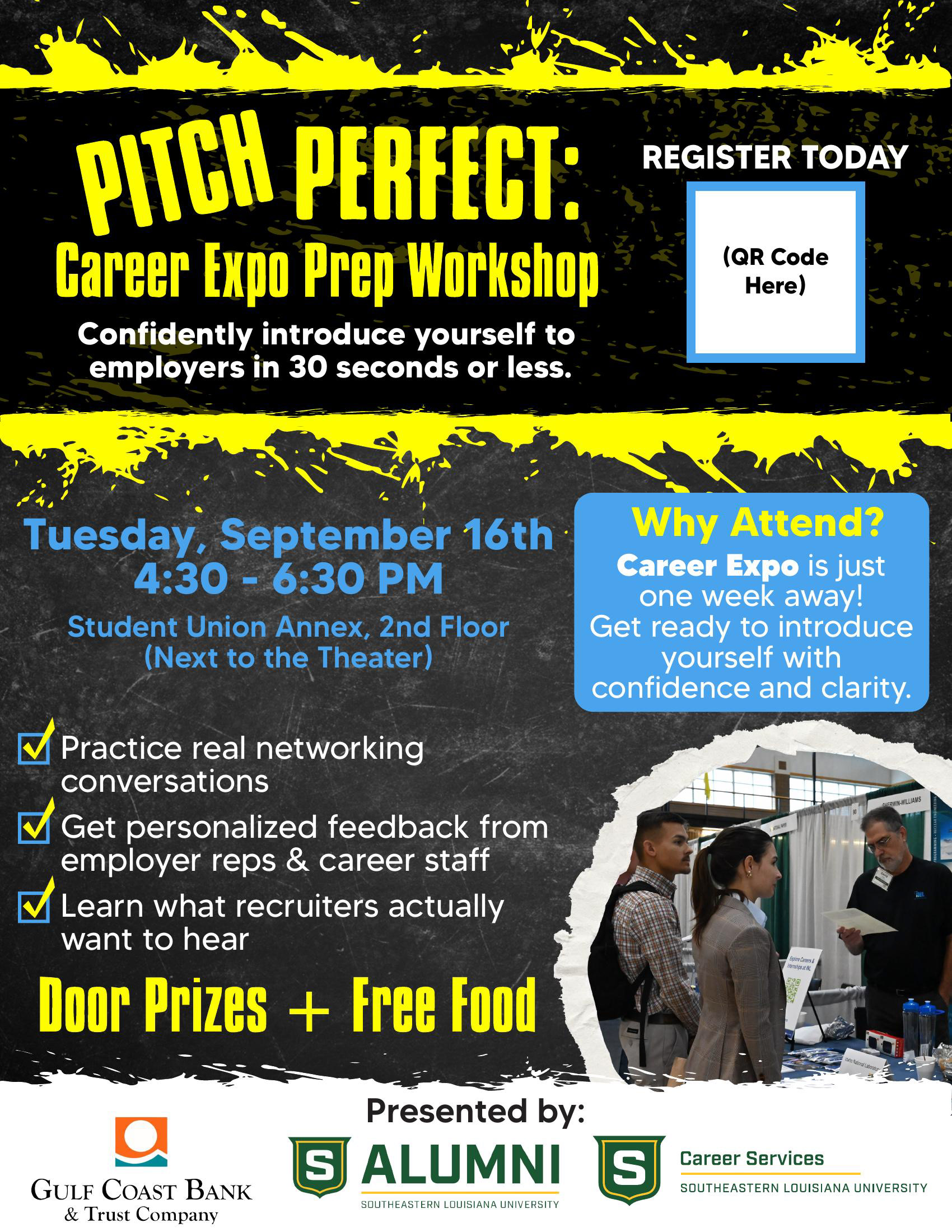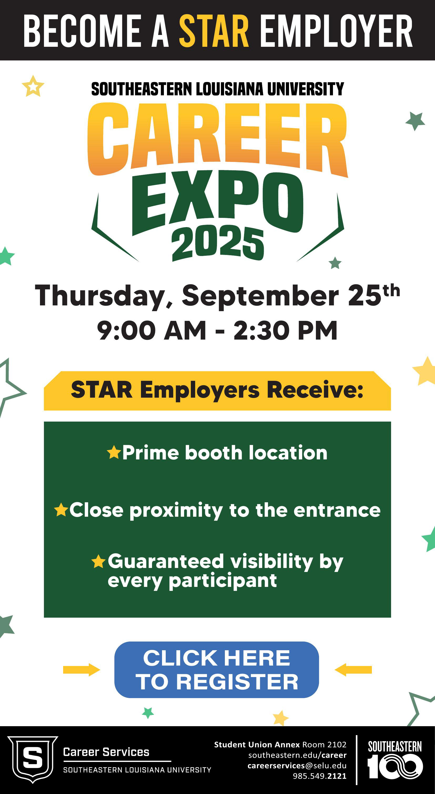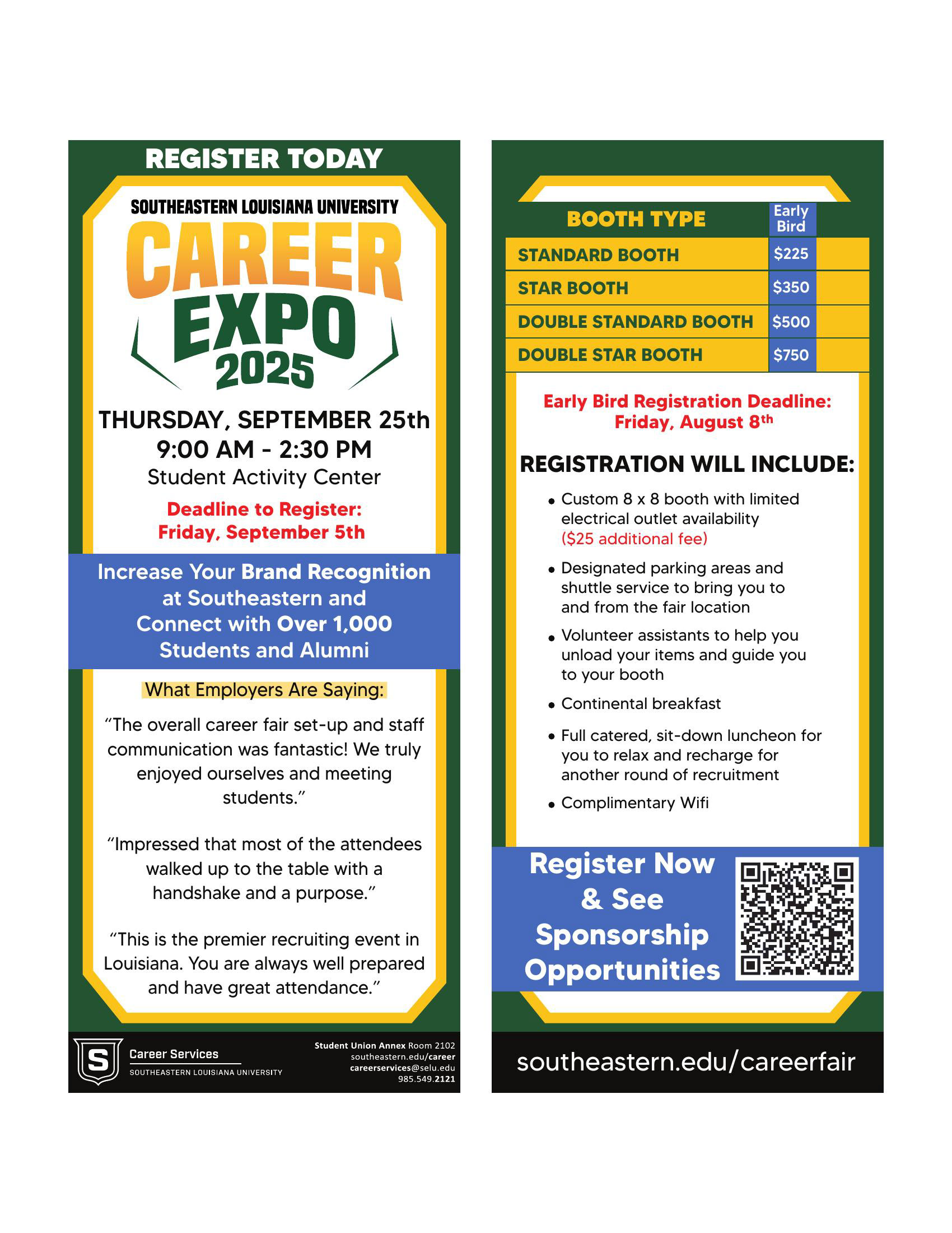 Career Expo is Southeastern Louisiana University Office of Career Services' all-major career fair, which takes place each September. Recruiters can engage with hundreds of Southeastern students to meet their hiring demands, and students can find a company that fits their needs. Career Services also holds Pre-Fair Events which prepare students for the Expo.