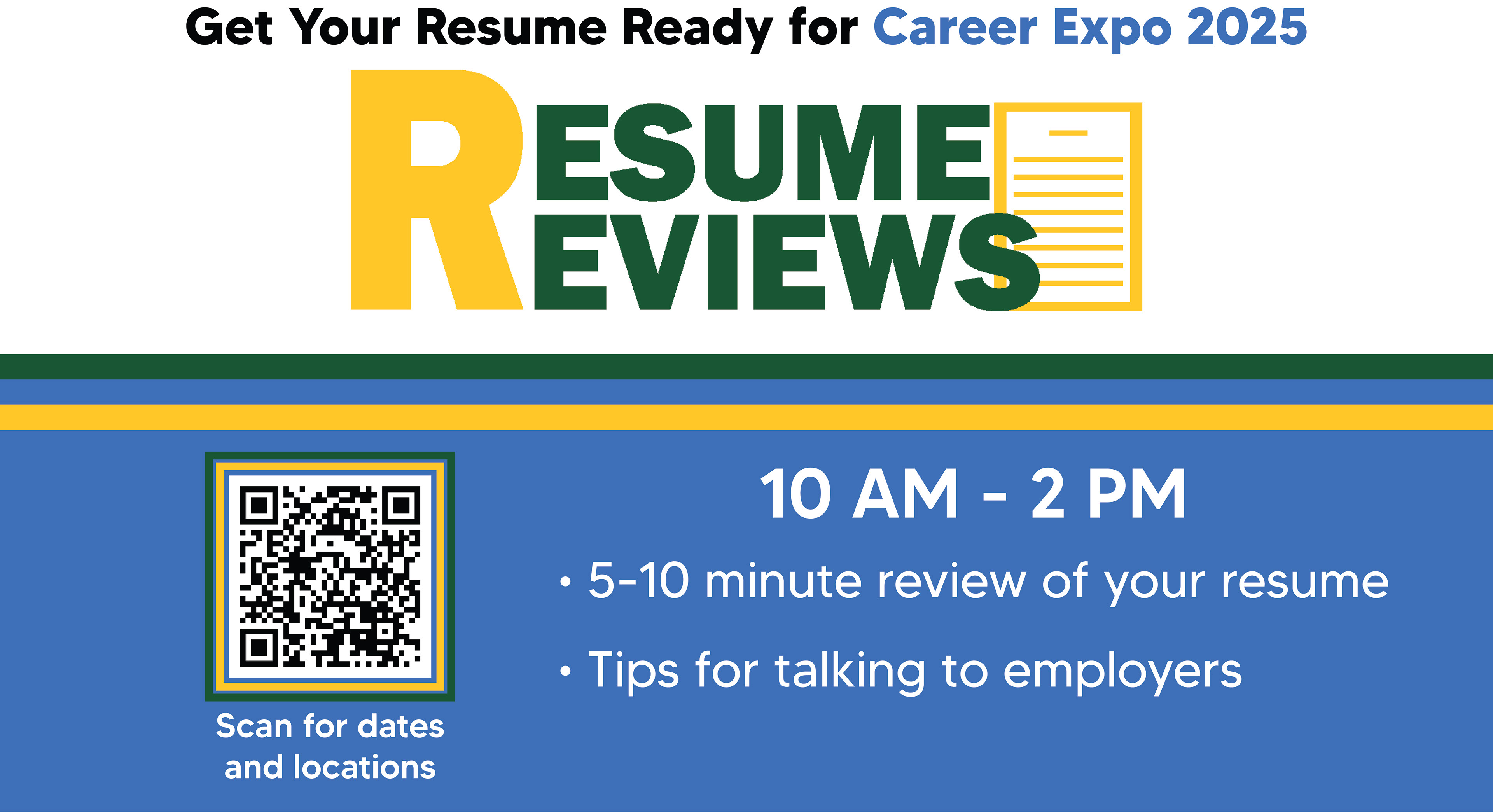 Pitch Perfect flyer, Resumania Flyer, and Resume Reviews TV Slide.