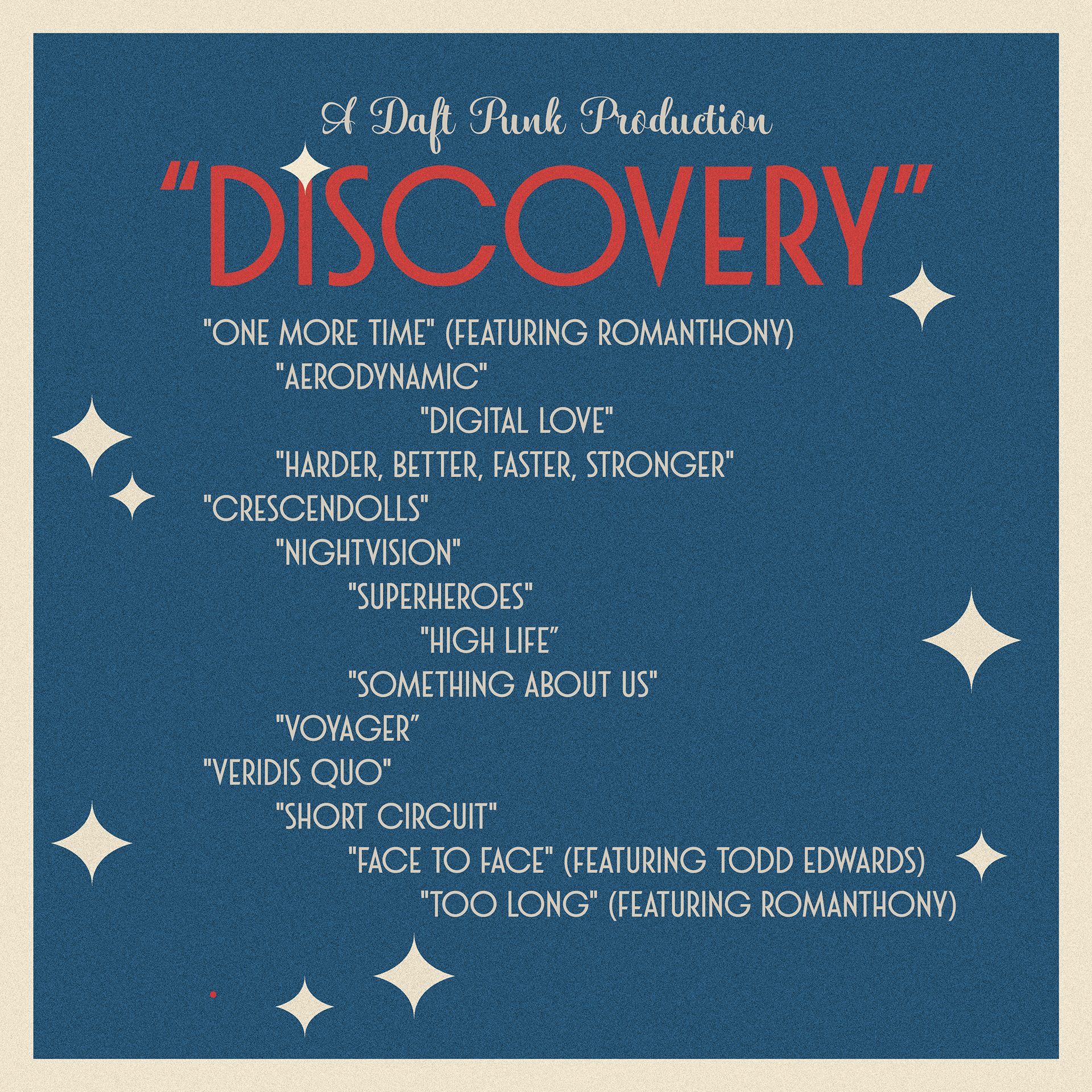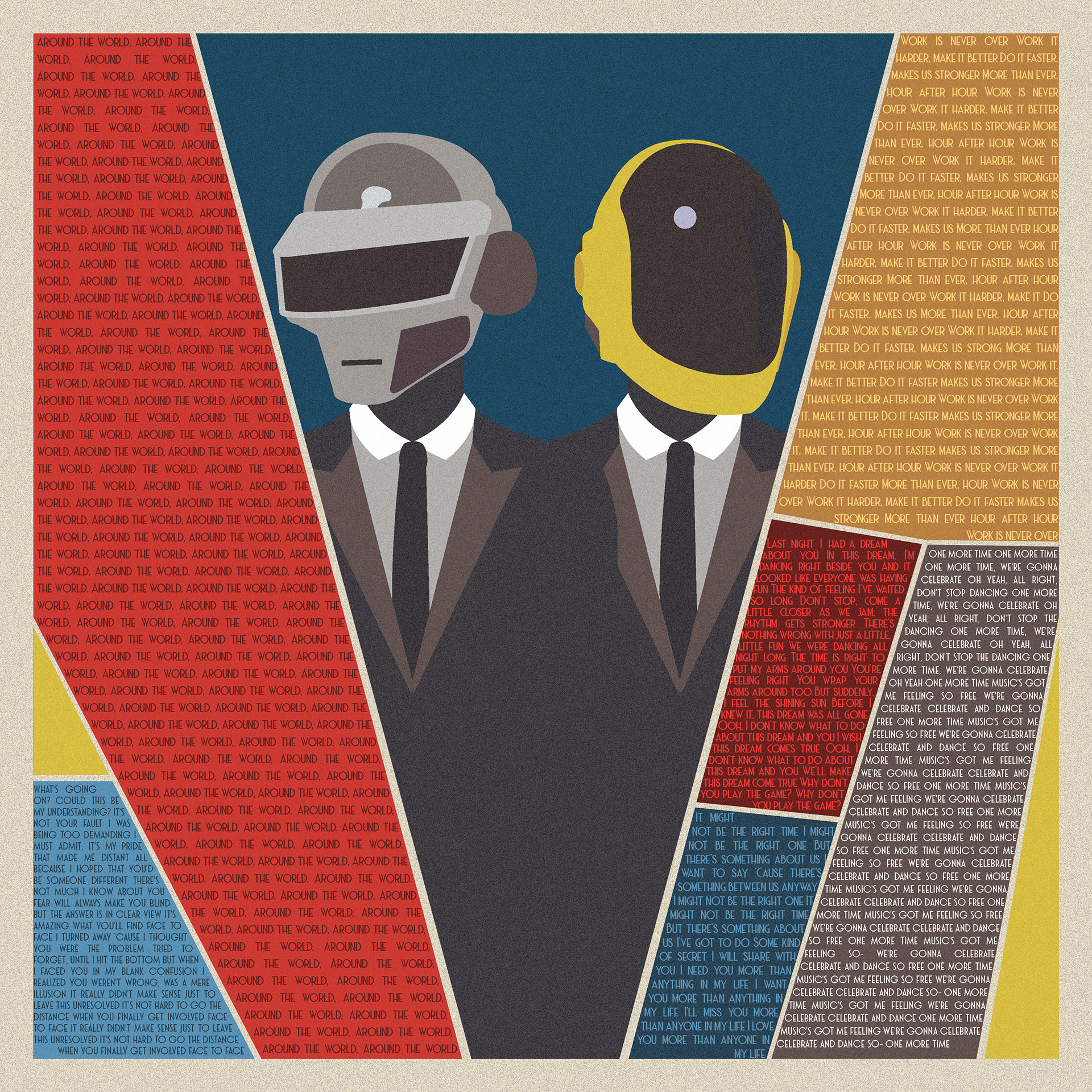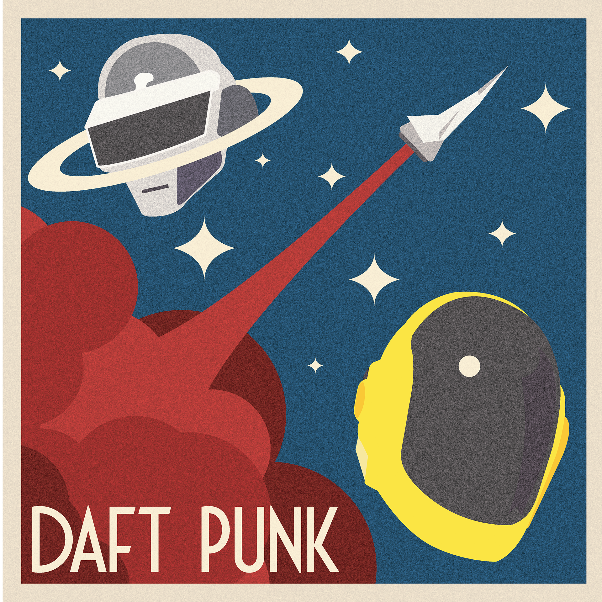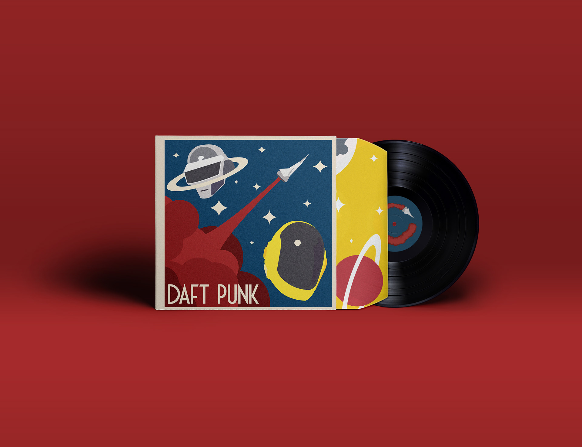 This album transforms the original futuristic aesthetic into a bold, retro-inspired cosmic journey. The use of flat, vibrant colors and minimalist shapes creates a sense of playful abstraction while still honoring the duo’s iconic visual identity.