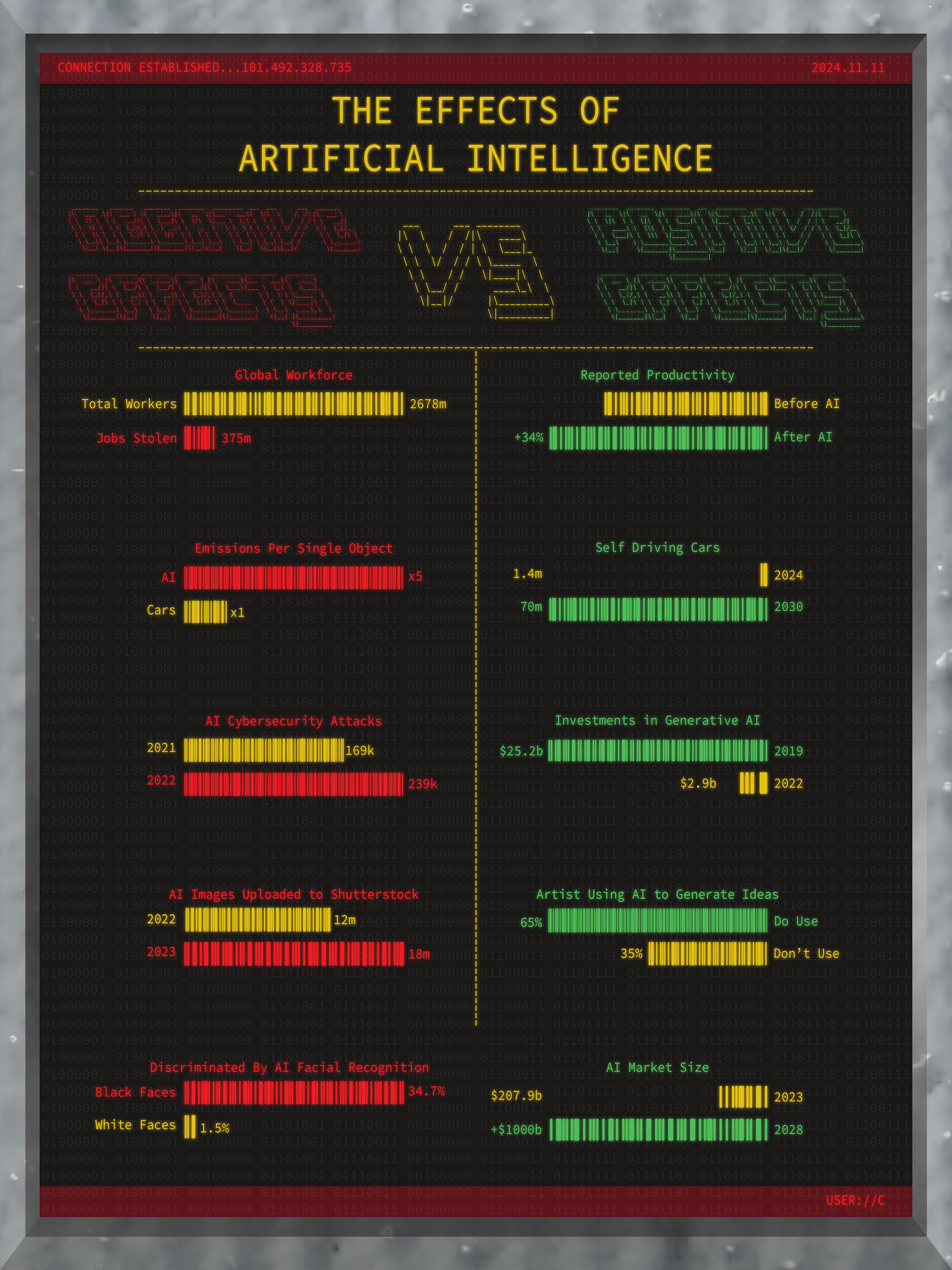 This infographic presents a stark confrontation between the negative and positive effects of artificial intelligence, framed in the style of a digital terminal inspired by that from the game "Marathon" by Bungie.